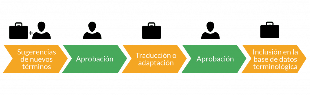 Independientemente de quién haya hecho la sugerencia, esta tiene que ser presentada ante aquellas personas a las que la empresa ha autorizado para aprobarla. Si es necesario traducir el término o la lista de términos a otros idiomas, la agencia de traducción se encargará de ello y posteriormente enviará de vuelta los términos traducidos para que sean aprobados antes de incluirlos en la base de datos terminológica. Independientemente del flujo de trabajo que se elija, siempre es aconsejable contar con un proceso escrito que describa cómo gestionar la lista de términos.