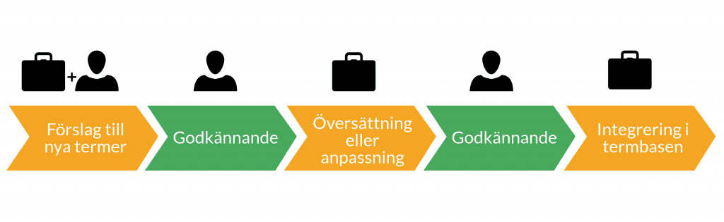 Oavsett vem förslaget kommer ifrån ska det vidarebefordras och godkännas av de personer i företaget som har fått den behörigheten. Om det krävs att termen eller termlistan översätts till andra språk ombesörjs det av översättningsbyrån, som därefter skickar vidare de översatta termerna för godkännande innan de integreras i termbasprogrammet. Oavsett vilket arbetsflöde som används är det alltid bra att ha en skriftlig beskrivning av processen för hur termlistan ska underhållas.